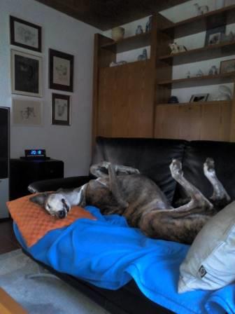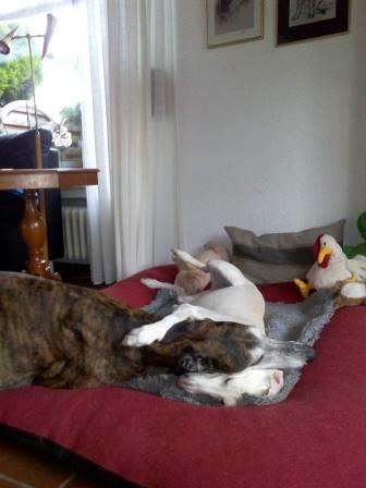 "Das ist Oskar, der im Febr. 2013 über die iWi zu uns kam. Wenige Wochen nachdem wir, kaum 8jährig, unseren Galgo Amigo verloren hatten und überhaupt nicht auf der Suche waren... Da hat Oskar uns "gefunden " , zog bei uns ein und war eigentlich sofort zu Hause! Verstand sich auf Anhieb mit Nenja und mutierte auf der Stelle zum "Patex-Oskar". Da wo wir sind ist unser Kleiner auch. Er beherrscht das "im-Weg-stehen" quasi in Perfektion ;-)