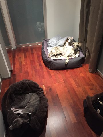 Und auch unser Sloughi-Bub Largo hat es geschafft; er zog bereits letztes Wochenende in die Pfalz zu zwei hübschen Whippet-Damen (manchmal hat es ja auch so seinen Vorteil, wenn ein Hund kastriert ist) mit Haus und Garten und zwei netten Jungs.