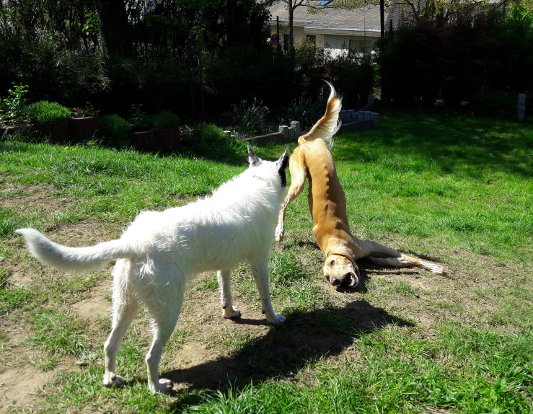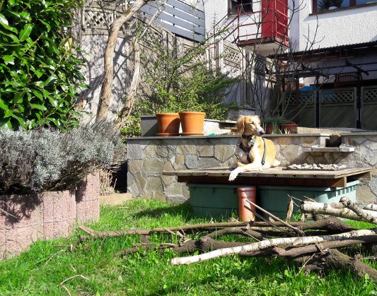 Da Nadijr ja nicht mehr so der grosse Tober ist, treffen wir uns nach wie vor mindestens einmal die Woche mit Nika, da können beide dann nach Herzenslust toben und rennen. Wir sind jetzt mit steigenden Temperaturen auch sehr viel in unserem Garten und Charime liebt es, dabei zu sein und auf Entdeckungstour zu gehen (Mäuse ausbuddeln, Goldfische verbellen, mit dem Springbrunnen spielen, im Teich baden ......).