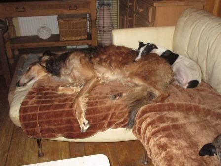 In den nächsten Tagen sind wir wieder ausgebucht mit Besuch. U.A. kommt für Momo ein Windspielmädchen. Uns ist schleierhaft, warum für Momo das Telefon bishe nicht heiß lief. Er zeigt sich bei uns völlig unauffällig und ist ein Oberkuschler. Ein Einzelplatz wäre für uns unvorstellbar, Momo liegt immer im Hundehaufen :-)