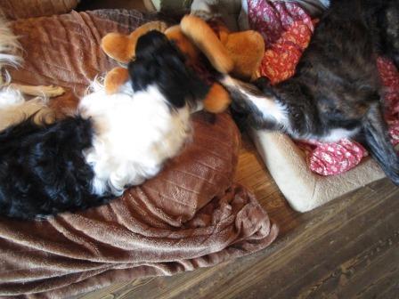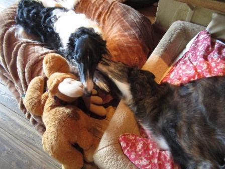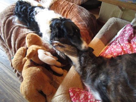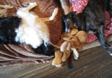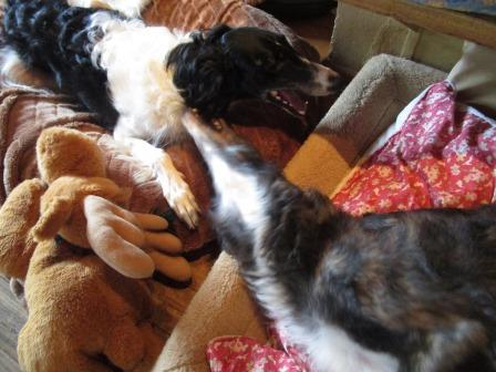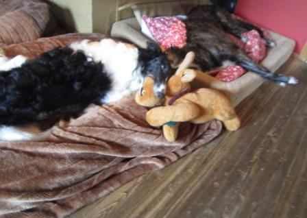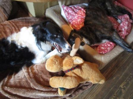 Hier zwei unserer "Ladenhüter" beim gemeinsamen Spielen, Joker und Coco, beide beinversehrt, beiden ist das aber völlig wurscht.