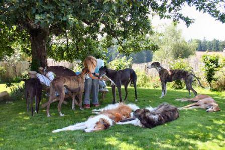 Die beiden hatten bereits unseren Ulianko und danach Mascha, eine Barsoihündin aus dem Münchner Tierheim über uns. Wir haben ein altes Foto von der Pflegestelle rausgekramt, Spätsommer 2004, Ulianko ist der rotweiße Bub vorne.