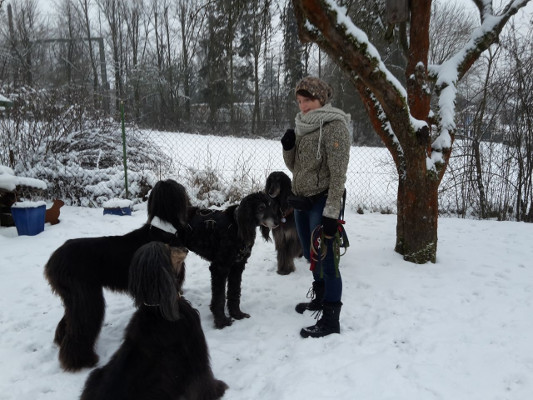 Ali hatte einen ganz schlechten Start im Leben, wir bekamen ihn völlig verwahrlost von einem Tierschützer übergeben. Es zeigte sich zu allem Überfluß auch noch, dass der Bub nicht der Einfachste war. Gott sei Dank verliebte sich unsere Kati in den Buben. Es dauerte dann ein 3/4 Jahr bis es soweit war: der Bub durfte zu ihr ziehen. Ein kleiner Schwarm von Afghanen-Mädels bereicherte zeitlebens sein Afghanen-Glück.