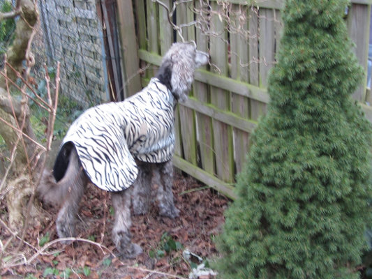 "Gestern hatte Nushnush Geburtstag, sie ist nun 13 Jahre alt. Sie ist eine Zuckermaus, die alle Hunde und Menschen liebt, was auf Gegenseitigkeit beruht. Ein Spaziergang mit ihr ist die wahre Freude. Zwei mal täglich sind wir weiterhin gemeinsam unterwegs. Während wir die Rüden je nach Wetterlage überreden müssen, ist Nushnush der Meinung, es gibt kein schlechtes Wetter nur unangemessene Kleidung. Sie läuft dann auch mit einem alleine weiter, wenn die Jungs vor allem aufgrund des kalten Regens mit dem anderen Gassigänger sofort nach Hause müssen. Da sie wegen ihrer "Kämmphobie" auch im Winter ein kurzes Fellchen trägt, hat sie wie die Jungs das passende Mäntelchen, was sie sofort super akzeptiert hat.