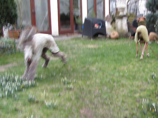 Nushnush ist noch immer ein fideles, gut gelauntes Mädel, deshalb habe ich das verwackelte Bild, auf dem sie mit Tenner rennend zu sehen ist, mitgeschickt. Aufgrund meiner "Fotokünste" gibt es ja sonst nur Standbilder."