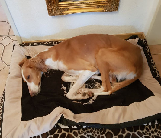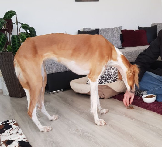 Neu in der Vermittlung ist die 4 Jahre alte Saluki-Dame Shoku in rot-weiß.