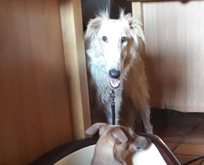 Eine 2 Jahre junge Barsoihündin in weiß mit hellroten Platten mit dem schönen Namen Melodie (siehe Fotos) und einen bildschönen, fünfjährigen Greybuben in rot, den wir schon mal kurz hier vorgestellt hatten: Blitzeblatze.