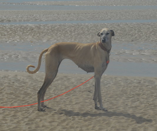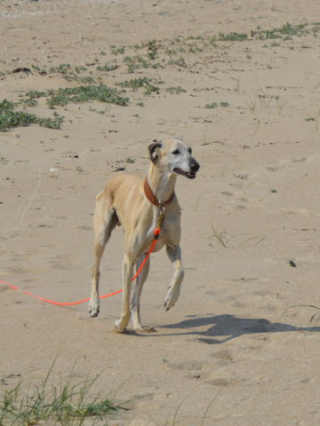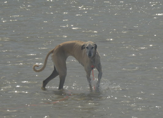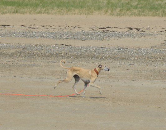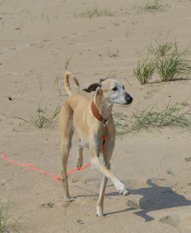 Wie man sehen kann ist sie strand- und wasserfest. Die Hübsche läßt sich mit Schleppleine für einen Sloughi recht gut abrufen.
