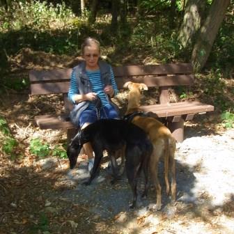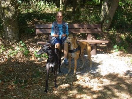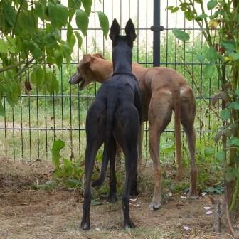 Von hier schicken wir Dir sonnige Septembertage! Der wunderhübschen Lady Saphire geht es bestens, und sie genießt Spaziergänge, Schmuseeinheiten, Quietschies, große und kleine Freiheiten. Da sie im Freilauf gut berechenbar ist und aufmerksam auf Zuruf reagiert, darf sie sogar im Wald ohne Leine laufen. Das kann ich dort Kumpel Fly nicht erlauben; der Oberjäger muss an der Leine bleiben. Sobald er einen langen Hals und eine noch längere Nase bekommt, wissen wir, dass Wild nicht weit ist, dann wird Saphi auf alle Fälle auch fixiert. Die Fotos aus dem Garten zeigen die beiden im Pirschmodus, denn außerhalb des Zaunes hatte sich