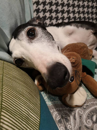 Das kleine Whippet-Mäuschen mit wohl einem Schuß Galgo saß damals in einem Tierheim und wir wurden um Hilfe gebeten.
