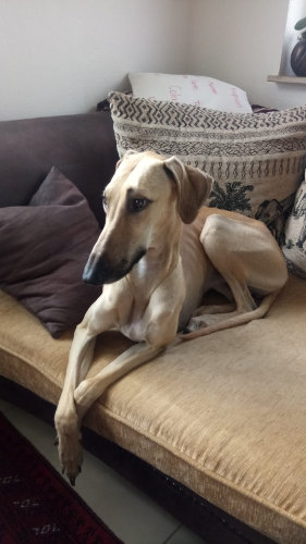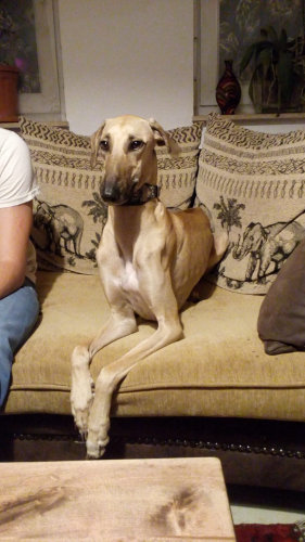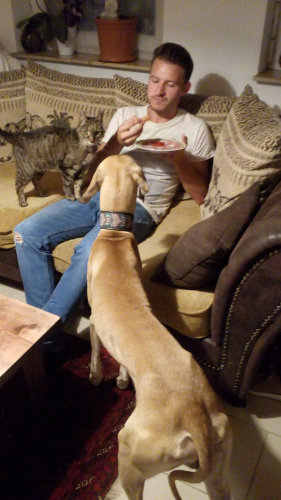 Brigitte holte gestern die Afghanen-Chortaj-Mix-Hündin Amira ab, die sich gerade in den letzten Zügen ihrer Hitze befindet. Setzt dann ihren essenden Sohn mit 22 Jahre alter Katze aufs Sofa und wie man sehen kann, Sohn, Katze, Essen - alles noch da :).