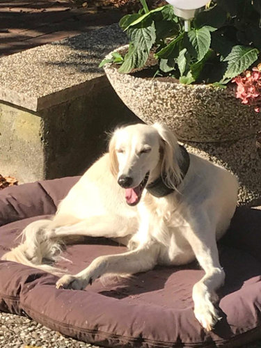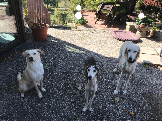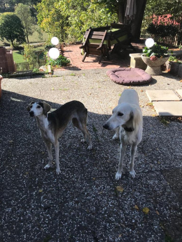 Nun rief er an, seine Tochter sei inklusive ihrem Hund ausgezogen (Kinder sind leider irgendwann auch erwachsen) und er säße nun mit einem traurigen Saluki-Buben da. Er bräuchte unbedingt eine Saluki-Hündin, kastriert, mittelalt.