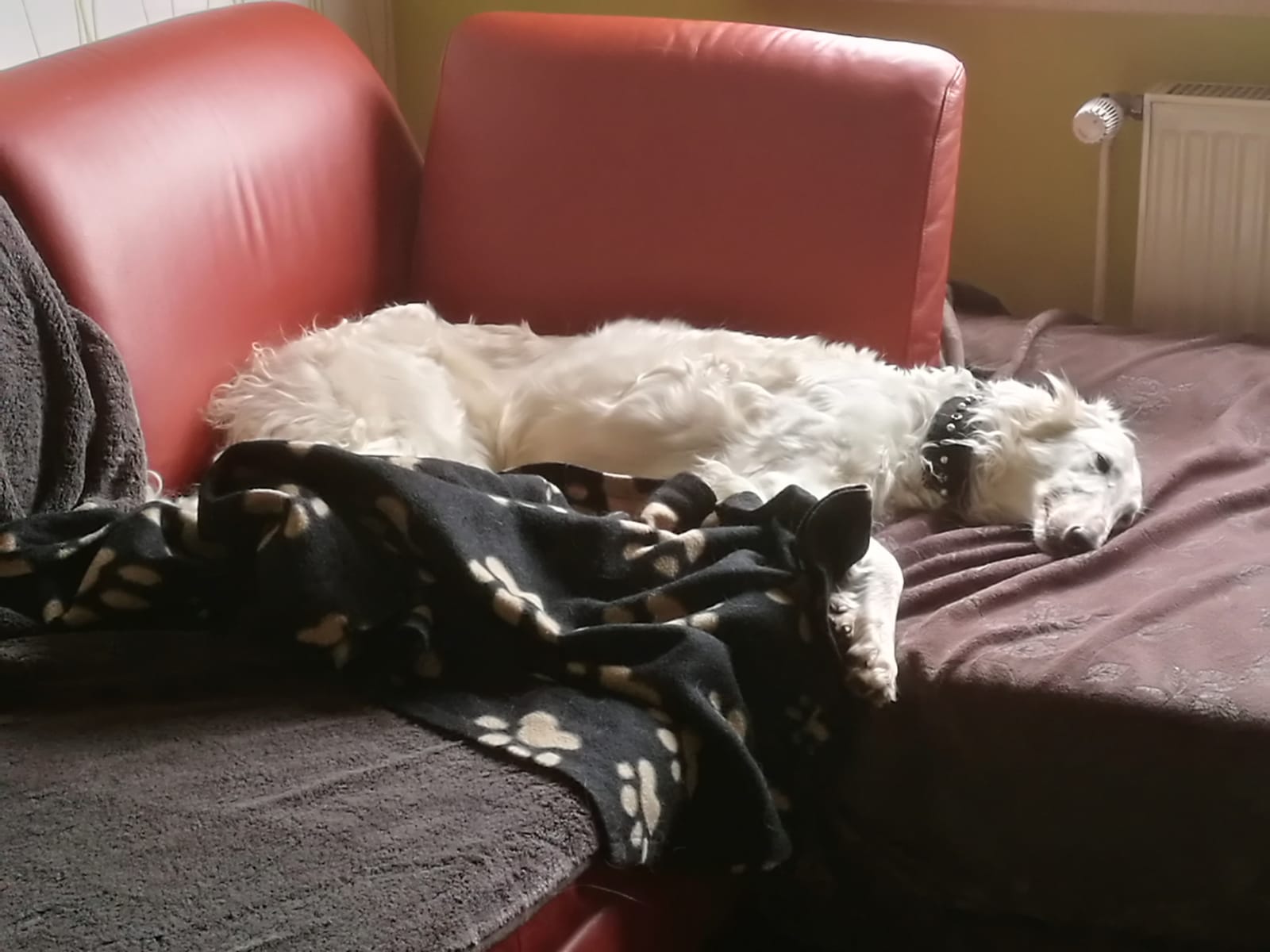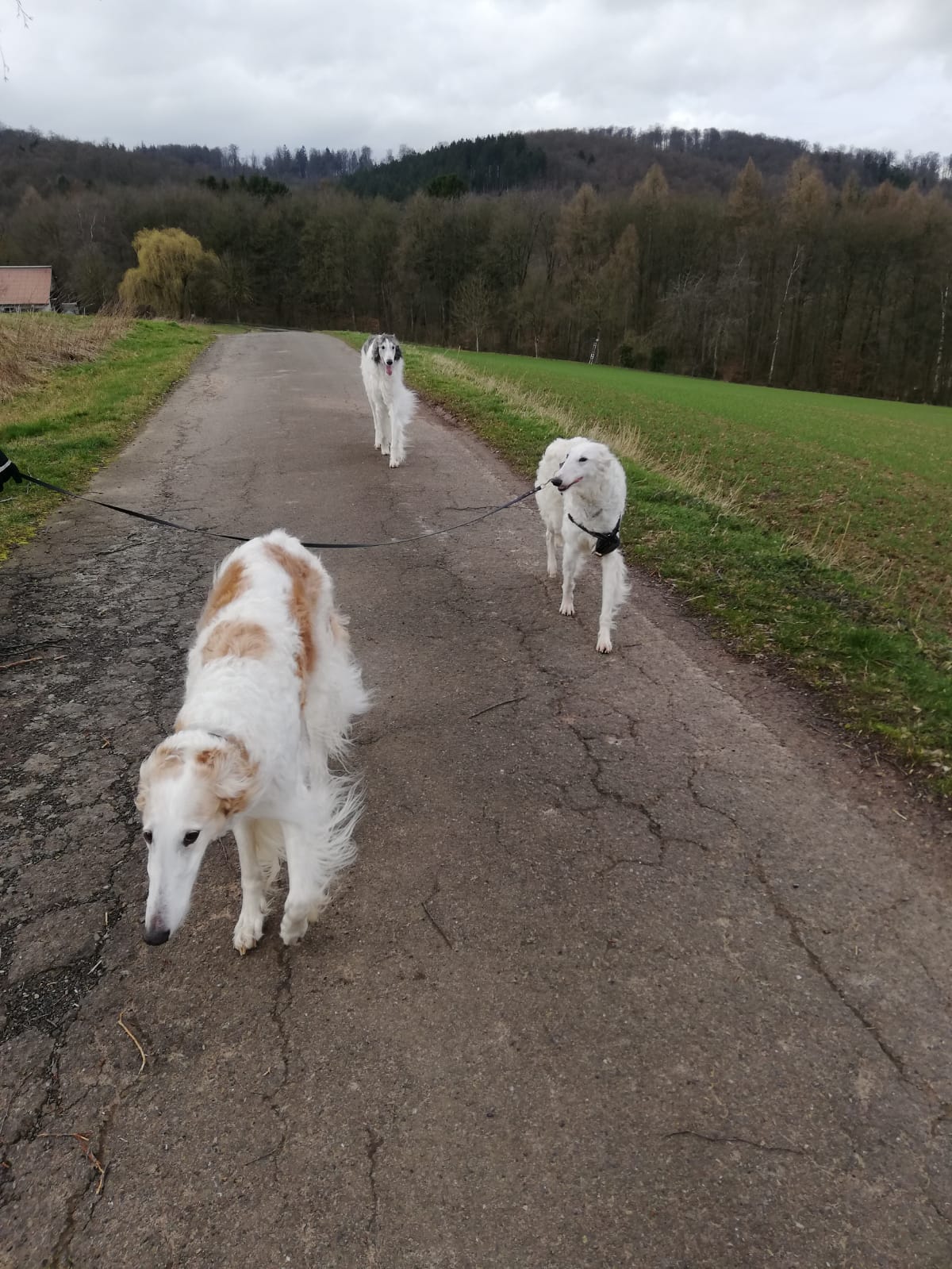 Sie hat zwei weitere Barsois als Gefährten. Die relativ schüchterne Madame taut zunehmend auf und lernt sehr schnell dank ihrer neuen Menschen, die ihre Sache richtig gut machen.