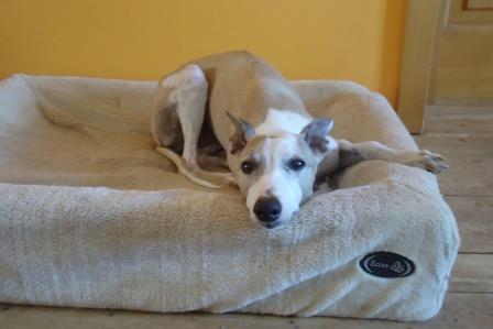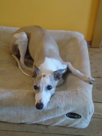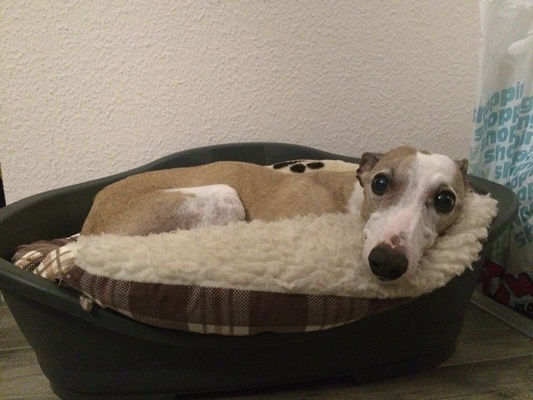 Die kleine Whippetine Hera hat übermorgen einen Kastrationstermin, gleichzeitig werden auch ihre Zähnchen gerichtet. Für sie haben sich mehrere Interessenten gemeldet. Wir schauen jetzt erstmal, dass die OP glatt geht und danach kümmern wir uns um ihr neues Zuhause. Sie braucht jedenfalls Whippetgesellschaft, soviel ist sicher. Hera liegt immer im Körbchen bei unseren Whippets und hat auch mit Whippetmädels kein Problem. Bei größeren Hunden kann sie zuweilen etwas zickig sein, aber das gestehen wir älteren Whippetdamen gerne zu.