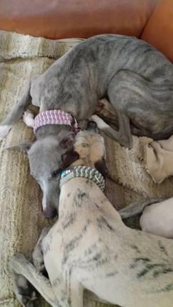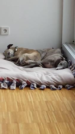 Wir sind ja immer gottfroh über neue Pflegemamas!! Selig haben wir die beiden Whippetmäuse Rani und Camina an Miriam übergeben, die sich bei uns als Neue gemeldet hatte. Haus und Garten, zwei Kinder, zwei kastr. Whippetbuben, passt. Rani und Camina hatte kein schönes Leben, sie wußten weder, wie ein Spaziergang aussieht, noch, dass man DRAUSSEN sein Geschäftle machen soll. Miriam hatte und hat noch alle Hände voll zu tun mit den beiden weltfremden Schätzchen und natürlich, solche wachsen einem ruckzuck ans Herz (die Whippets sowieso, das ist ganz übel, sowas zu pflegen:-). Nun, was sollen wir lange erklären, heute kam die Nachricht: SIE BLEIBEN!