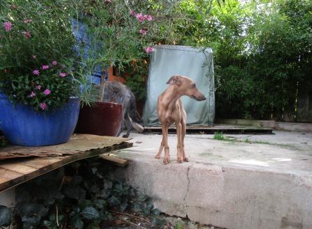 Also mit Abstand betrachtet, benötigten wir für Remo mindestens ein Windspiel zum Schlafen und wilde Hunde zum Spielen. Schwierige Aufgabe, zudem kann Remo locker aus dem Stand über einen 1,20 Meter Zaun hüpfen. Unser Küchengitter war natürlich auch kein Problem. Trotzdem mußten wir uns um ihn keine Sorgen machen, eben weil er kein typisches Windspiel ist und er ganz feine Antennen dafür hat, mit welchem Hund man Toben kann und um welchen man lieber einen Bogen macht. Unser kleiner Enzo weiß das bis heute noch nicht:-)