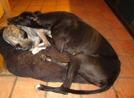 Jetzt gehts nur noch um die drei Katzen, wir hoffen, sie werden Honeys Einzug überleben... Aber Annette hat das ja auch schon mit Azi-Barsoi-Mix Jonas und Grey Spicy geschafft. Letzterer hat sich wohl sehr über die neue Freundin gefreut.