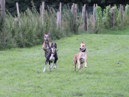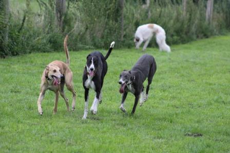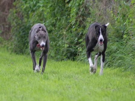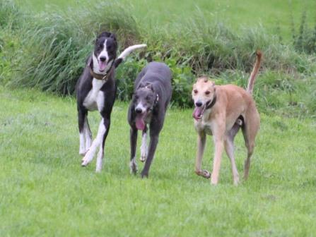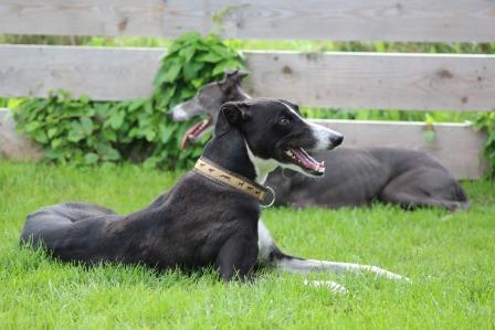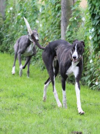 Seit Donnerstag ist ja auch Liam (links) bei uns. Der zweijährige Greyjunge ist sehr, sehr lieb, mit Kindern, mit Hunden, null Probleme.