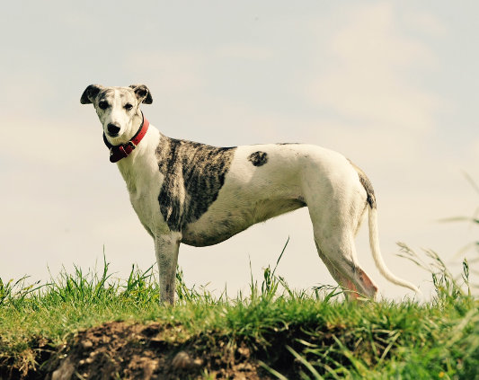 Shaggy, ein 5 Jahre altes Whippet-Mädchen, lebt seit einer Woche auf einem unserer Pflegeplätze.