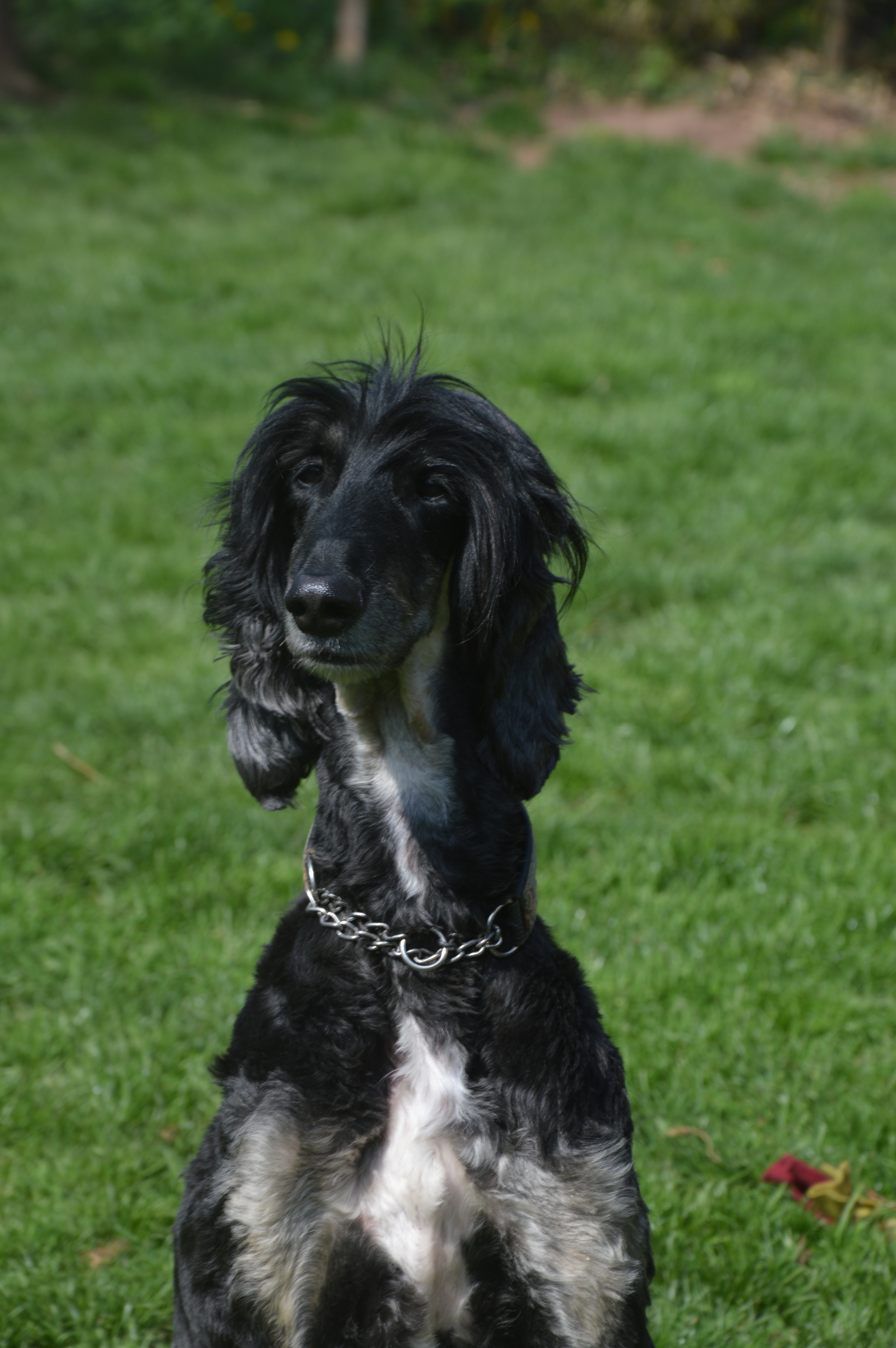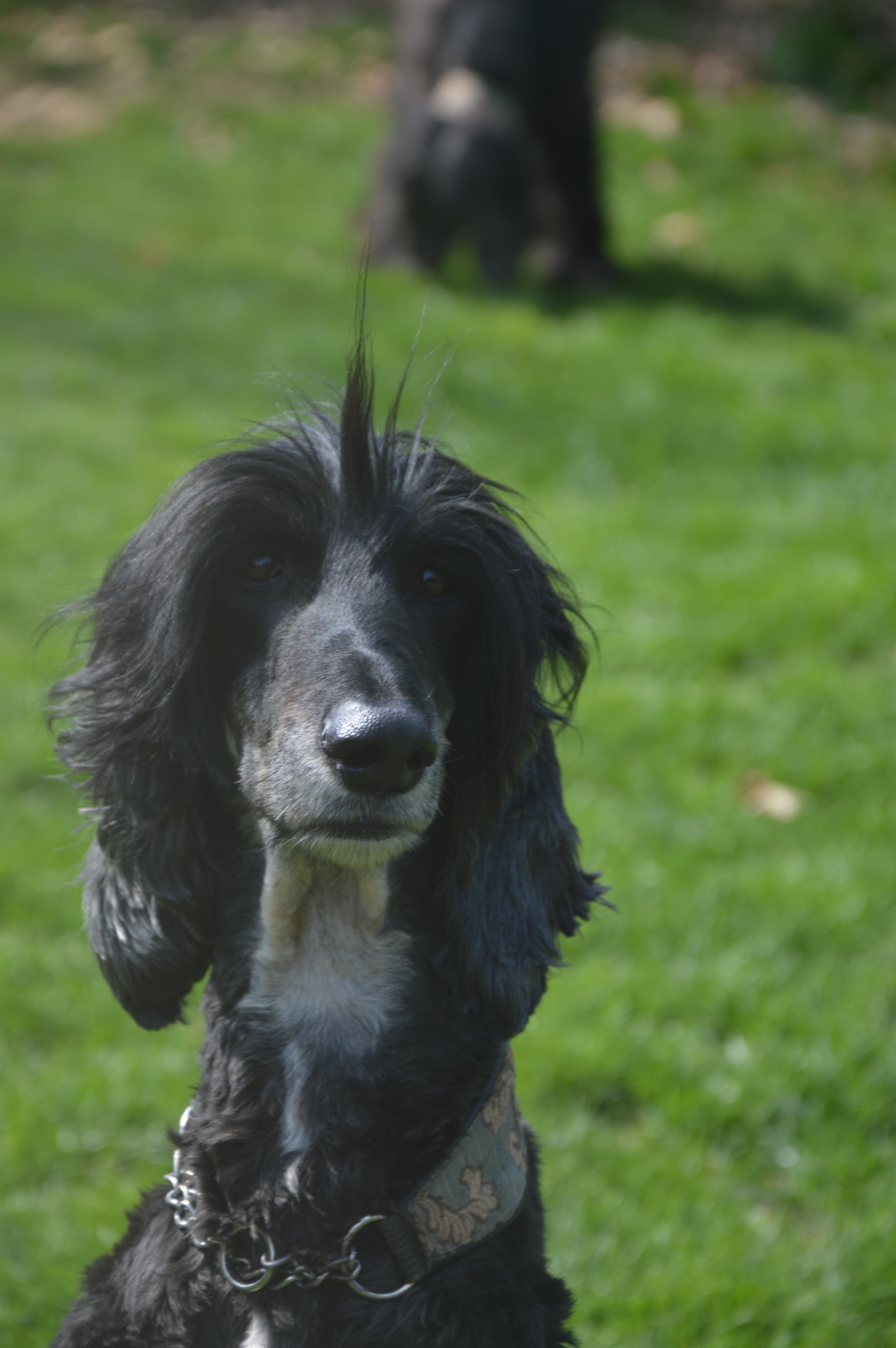 Trotz seines extravaganten Haarschnitts ist er ein echtes Prachtexemplar, das unsere Gesellschaft und die der anderen Afghanen genießt.