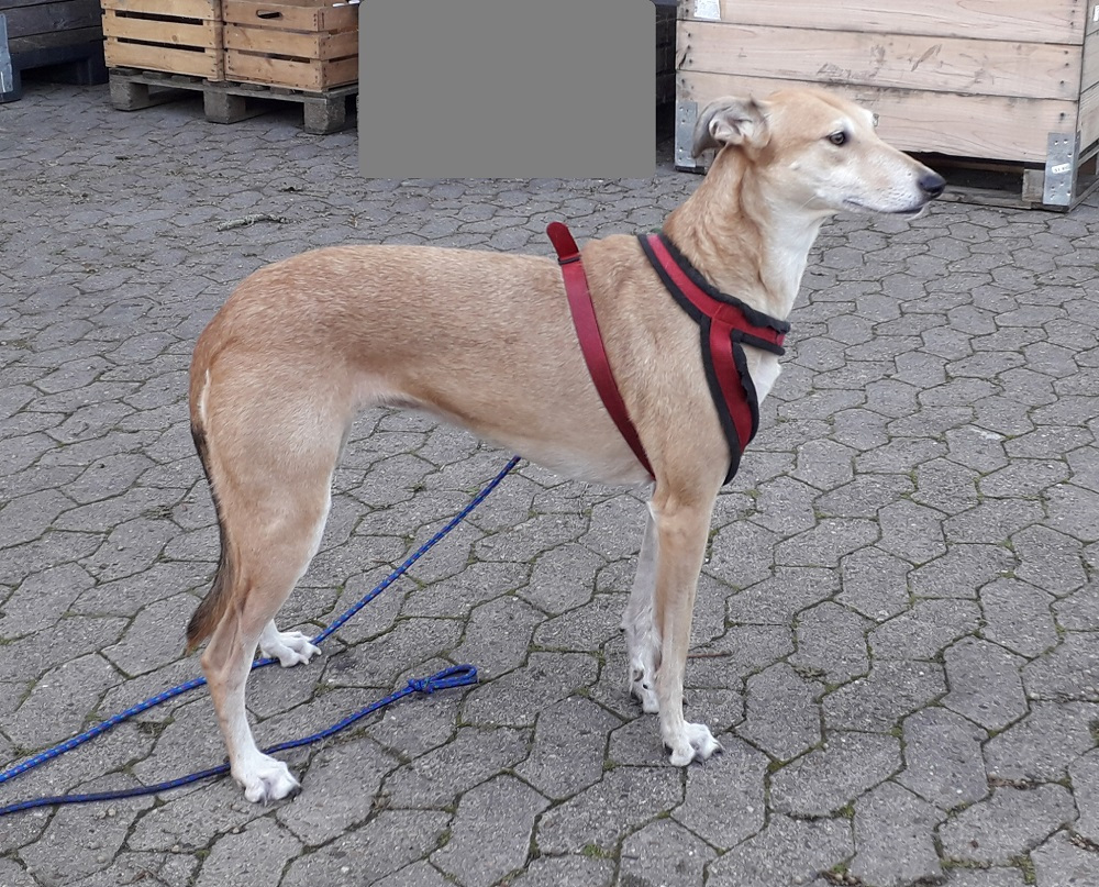 Sie ist ca. 65 cm groß (die Bilder täuschen etwas, also sie ist definitiv wesentlich größer als ein Whippet).