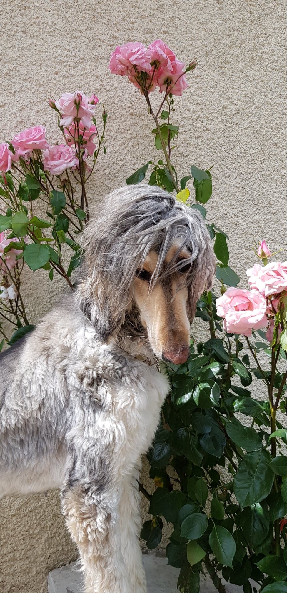 Er hat nun drei afghanische Gefährten, ein Frauchen, das den ganzen Tag Zeit für ihn hat, Haus & Garten – eben alles was ein Afghane liebt.