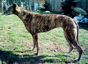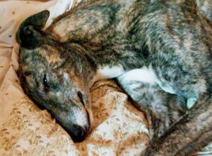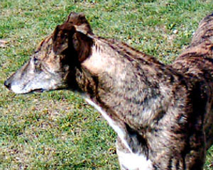 Das ist Britney, eine 5 jährige, sehr ruhige und verschmuste Greyhündin. Als wir von ihrem Leid gehört hatten, konnten wir nicht anders, als ihr zu helfen. Ursprünglich kommt sie von der Rennbahn in Barcelona, gezüchtet wurde sie in Irland. Sie kann ihr Glück noch gar nicht fassen. Sie besitzt so eine innere Traurigkeit, die uns ihre schreckliche Vergangenheit nur erahnen lässt. Trotz der Tatsache, dass sie jahrelang in einem engen, dunklen Käfig leben mußte, war sie vom ersten Tag auf unserer Pflegestelle an stubenrein. Sie liebt alle Menschen, egal ob groß oder ganz klein. Auch mit allen anderen Hunden kommt sie prima aus, sogar wenn's ums Fressen geht und eine andere Schnauze in ihrer Schüssel kramt, behält sie die Ruhe und frißt einfach friedlich weiter. Ruhe, Sanftheit, Liebenswürdigkeit - das ist Britney.