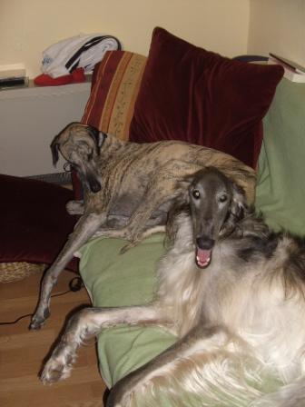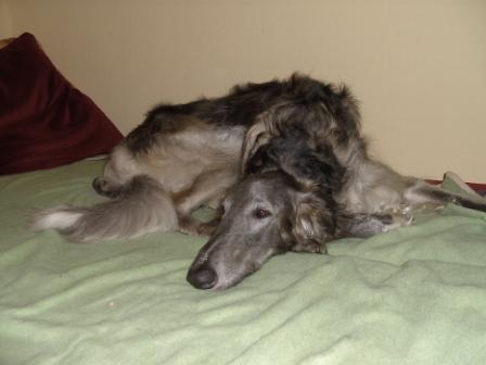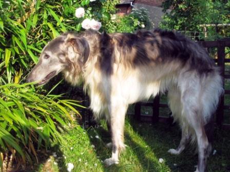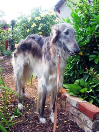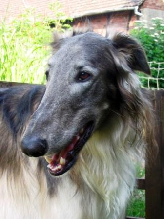 Oblong, kastriert, drei Jahre alt, bisher hatte er eine barsoierfahrene Kinderstube nun ist er gestern zusammen mit Popoff bei uns abgegeben worden.