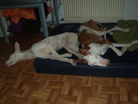 Beide sind "Neandertaler", kennen bisher GAR NICHTS, sind dem Menschen gegenüber scheu (Geronimo ist der kräftigere, weniger scheue Rüde), sonst jedoch sind beide sehr neugierig und interessiert an ALLEM, wie z.B. Matratzen, Kisten, geöffnete Kleiderschränke; im Prinzip an allen Gegenständen, die mit irgendetwas gefüllt sind. Diese gefüllten Gegenstände werden dann sorgfältig untersucht, zerkleinert, die "Füllung" genauestens aussortiert und "in Form" gebracht.