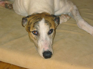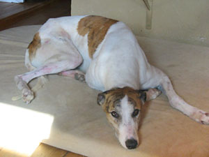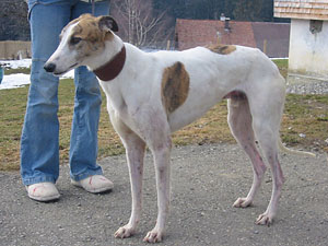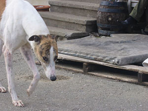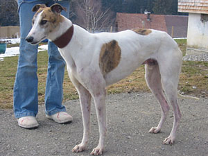 Greyhound-Rüde Romano wurde in England geboren, lief dann auf irischen Rennbahnen, wurde nach Spanien verkauft und wartete in Barcelona in einer Lagerhalle mit 800 Greys in doppelstöckigen Käfigen auf seinen Renneinsatz. Nachdem er vom einem Tierschützer betreut wurde kam er zur Windhundhilfe.