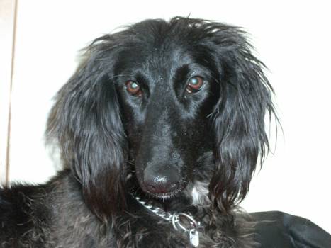 Bella, eine ca. 1 Jahre alte schwarze Afghanen-Saluki-Mix-Hündin, sucht ein neues Zuhause.