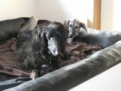 „Heute Morgen um halb fünf blieb für uns wieder die Zeit stehen. Schon wieder. Bella ist tot. Wir fühlen uns noch ganz erstickt davon, dass Gizai gerade gegangen ist. Und jetzt Belli. Es gab keine Wahl, keine Alternative, keine Möglichkeit mehr irgendwie unser Bellchen zu retten. Renales Lymphom und dazu jetzt schwere akute Pankreatitis. Keine Minute länger sollte sie die nicht zu beherrschenden Schmerzen ertragen müssen. Bella kam im November 2013 ganz unverhofft zu uns. Eigentlich wollte ich nur die 12,5 Jährige Indra am anderen Ende Deutschlands abholen. Und dann erfuhr ich auf dem Wege von Karin (bei der ich Pause machte), dass die Tochter meines Möbbchens von ihren Adoptanten nach wenigen Wochen zurückgegeben wurde, weil sie über den Zaun sprang. Spontan machte ich auf dem Rückweg einen „kleinen Umweg“ über den verschneiten Hochschwarzwald und dann hatte ich zu der geplanten Saluki-Rentnerin noch einen jungen Afghanen-Saluki-Mix-Hüpfer im Auto. Gut dass Hendrik, der beste Mann der Welt genauso verrückt ist wie ich. Und was für ein toller Hund war sie. Zehn Jahre lang hat die kleine schwarze Italienerin unser immer wieder neu zusammengewürfeltes Rudel aus meistenteils körperlich oder seelisch angeschlagenen, oft steinalten Salukis, Barsois, Afghanen und Tazis gemanaged. Souverän führte sie die Hunde ohne körperlich grob zu werden. Sie hat immer sehr getrauert wenn ein Hund aus unserem Rudel ging. Ich stelle mir vor jetzt gerade tobt sie mit all unseren Hunden im Sonnenschein im Jenseits und lässt es sich richtig gut gehen. Belleflitz, Rudelchefin, Piratin, Zauberhund, Fusselina, Wie sollen wir denn leben ohne Dich?“