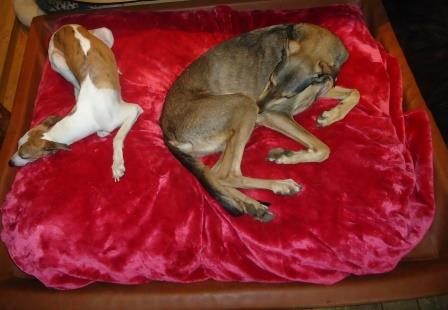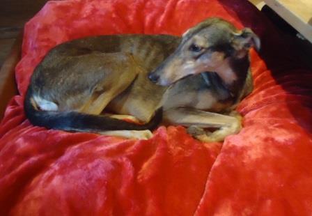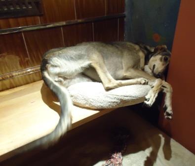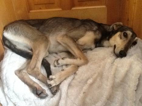 Domino ist wieder ganz die "Alte". Sie ist immer in der Nähe der Pflegemama zu finden, versteht sich mit allen im Rudel, schlingt ihr Futter runter und guckt den gemütlicher Fressenden zu, ohne auch nur die geringsten Anstalten zu machen, etwas naschen zu wollen.