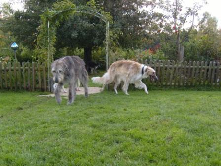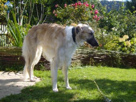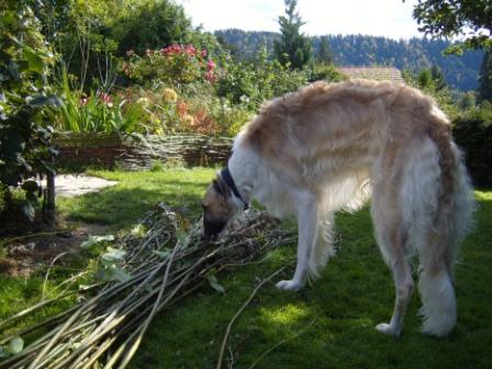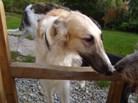 Noch bemüht er sich um Unauffälligkeit in unserem Rudel und schleicht durch den Garten. Cao ist wie die meisten Barsois sehr anhänglich und verschmust mit allen Menschen.