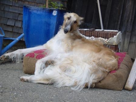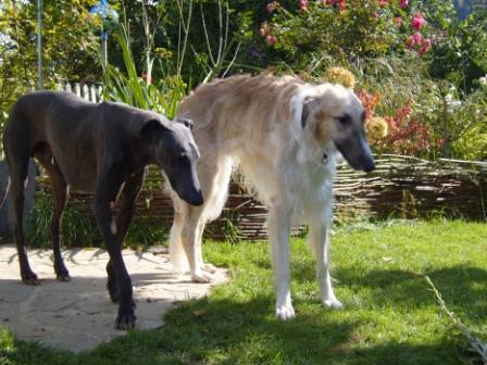 Der schöne Cao hat Freitagnacht, oder besser Samstagmorgen um halb zwei sein Zuhause erreicht. Die weite Fahrt hat sich auf jeden Fall gelohnt, eine nette Barsoifreundin sowie ein Grey (beides ex-iWi-ler) haben sich schon mit ihm angefreundet. Über sechs Monate genoß Cao unsere Gastfreundschaft, er ist seiner Pflegemama sehr ans Herz gewachsen und das, obwohl er anfangs -typisch Junghund- nur Unsinn im Kopf hatte und ziemlich viel Einrichtungsgegenstände zerpflückte oder auch "nur" zernagte. Seine Hörner hinsichtlich Nageanfällen hat er inzwischen abgestossen, an die Begegnungen mit nicht-Windhunden muß er sich noch gewöhnen. Nobody is perfect - das wird schon noch!