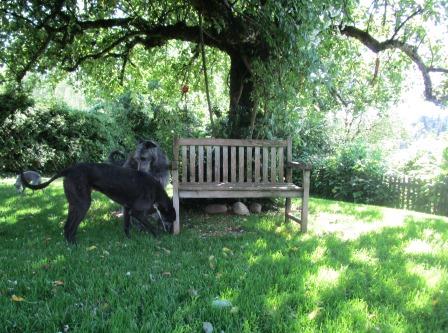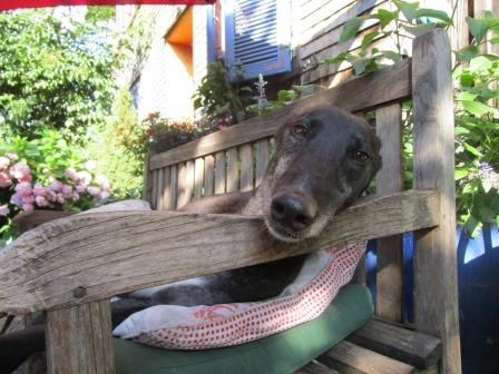 letzter Tag der Affenhitze. Ronan muß einfach immer beim Frauchen sein, selbst beim morgendlichen Blumengießen, was er von der Gartenbank aus hechelnd beobachtet.