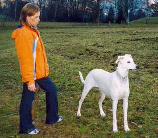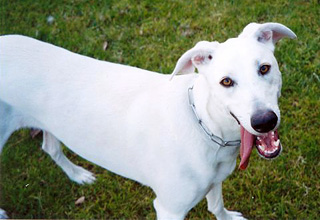 "Blanco", 1,5 Jahre alt, kastriert. Sein Frauchen konnte ihn aus privaten Gründen nicht behalten und hat ihn einer Bekannten gegeben. Dort wurde Blanco nicht sehr windhundgerecht behandelt, daraufhin fuhr sein Frauchen über 1000 km, um ihn auf eine iWi-Pflegestelle zu bringen.