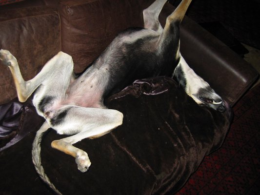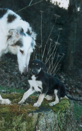 Ich wollte nie einen Kurzhaar-Windhund haben, ich fand sie sogar ausgesprochen häßlich mit ihrem dürren Körper. Als Asla kam war sie ein halbes Jahr alt. Sie war ein "Unfall-Baby", Mama Barsoi, Papa Sloughi. Die "Züchterin" wußte nicht wohin damit. Ich damals eigentlich auch nicht (damals noch WiN). Es meldete sich ein älteres Ehepaar, das bereits einen Azawakh und einen Sloughi gehabt hatte.