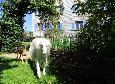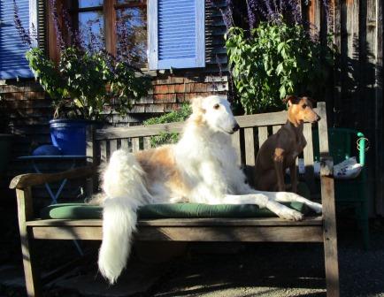 Seit gestern ist der sechsjährige Borja auf einer Pflegestelle. Er versteht sich hier mit allen Hunden, rennt durch den Garten, hüpft wieder ins Haus und scheint den ganzen Tag zu Lächeln. Polternde Menschen mag er nicht (wir auch nicht) und vor unserem frechen Enzo hat er Angst. Enzo ist ein Windspiel. Streicheleinheiten kann er nie genug bekommen und er folgt uns ständig, bei der Gartenarbeit steht er immer unterm Baum... neben der Schubkarre oder hinter der Leiter, er liegt vor dem WC, neben unserem Bürostuhl... Von Borja geht keinerlei Aggression aus, er liebt es ruhig und kennt viele Dinge noch nicht. Er hatte kein schönes Leben und ist glücklich mit einem Qietschi oder auch, wenn er in der Sonne liegen kann. Eine Seele von Barsoi!