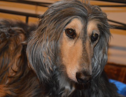 Enya, eine 6 Jahre alte Afghanen-Hündin in dominofarben, sucht eine neue Familie.
