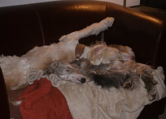 Er hat bei seinen Vorbesitzern einige Würfe produziert, u.a. ist er der Vater unserer Daisy. Auch ein Wurf reinrassiger Afghanen ist dort gefallen, zwei der Kinder Mona und Ella mußten wir weitergeben. Manny war in einem recht schlechten Zustand als er zu uns kam, unterernährt und neben den Verfilzungen hatte er vereiterte Zähne, die Ohren waren so kaputt, dass er in jedem Trommelfell ein Loch hatte. Unser Tierarzt sanierte Gebiß und spülte die Ohren, beides ließ Manny wieder erwachen. Ein imposanter und souveräner Bub, der sich in den vergangenen 6 Wochen schon gut erholt hat. Wir schrieben damals, wir suchen einen Pflegeplatz für einen Seelenhund. Unsere Andrea meldete sich: Sie habe die Mama und würde gerne den Sohn nach Hause holen. (Um Missverständnissen vorzubeugen, die Mami konnte Andrea vor Jahren in Zuchtrente übernehmen.) Unser Luxus-Afghanen-Shuttle in der Not wurde gerufen und der Bub reiste von Süd nach Nord. Tausend Dank an dieser Stelle wieder einmal an Monika ! Andrea stellte bereits in kürzester Zeit fest, dass Manny ein richtig toller Typ ist, auch seine Mama mochte ihren kleinen, mittlerweile großen, Buben spontan. Dann kam der Anruf vom Amtsvet, die Afghanen müssen abgegeben werden. Supergau. Nicht dass uns Pflegstellen die Weitergabe der Hunde leicht gefallen wäre, doch für eine Privatperson, die nicht andauernd damit konfrontiert ist, Hunde weiterzugeben, gleicht eine solche Nachricht einem Weltuntergang. Viel Bauchweh und Schlafdefizit begleiteten die Wochen bis fest stand, dass Manny bleiben darf.