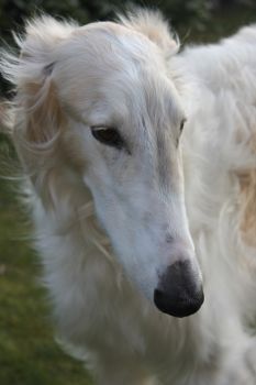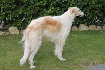 Sechs Jahre jung ist Juri. Der ca 81 cm große Barsoibub ist verträglich mit den meisten Hunden, bei kleineren kann erhöhte Aufmerksamkeit erforderlich sein.