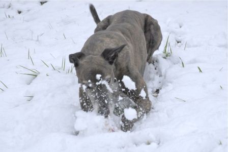 Er liebt alle Menschen, Hunde, das Auto fahren, das einfach dabei sein, ein Teil zu sein. Er kann ohne Probleme alleine sein. Er spielt gerne mit anderen Hunden, aber auch wenn man ihm einen Ball wirft. Bei Leckerchen fängt er an zu schielen, er gibt laut auf Kommando, Sitz und Platz sagt ihm auch was.