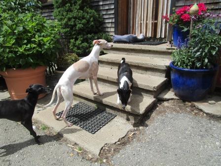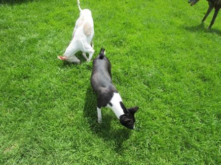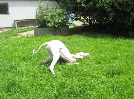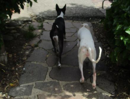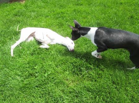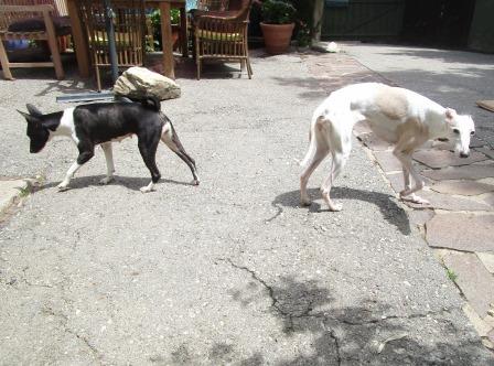 Vicky, Whippet, 10 Jahre und Imba, Basenji, 9 Jahre, sind zwei ganz arme Schnuckis. Sie lebten inmitten einer Großstadt in einer Etagenwohnung, weit und breit kein Grün, vermutlich kein Spaziergang, denn an der Stubenreinheit muß noch kräftig gearbeitet werden.