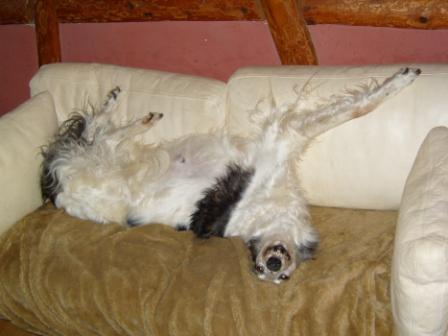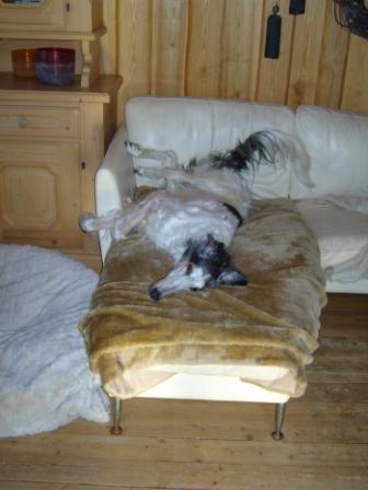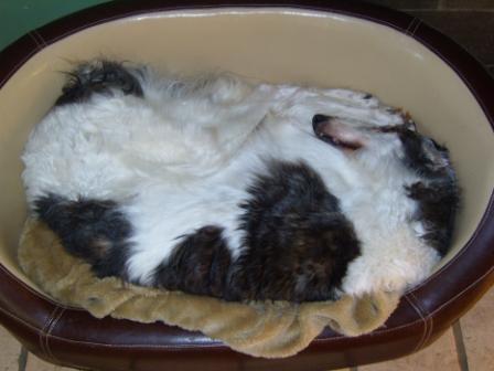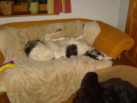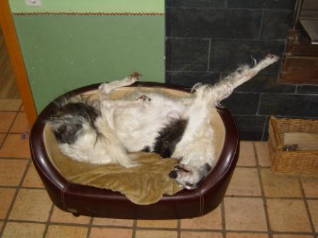 Bertha geht es hervorragend. Sie hat ihre Hitze gut überstanden und rennt neuerdings die Treppen hoch wie eine Junge, um sich oben für ihren Schönheitsschlaf auf ein Sofa zu werfen. Abends ist sie auf ihrem eigentlichen Lieblingsplatz zu finden, einem grossen Büffel-Lederbettchen mit vielen Decken und Kissen. Bertha hat guten Appetit und ist dank Phen-Pred so gut auf den Beinen, dass sie nur noch ganz leicht ab und zu hinkt.