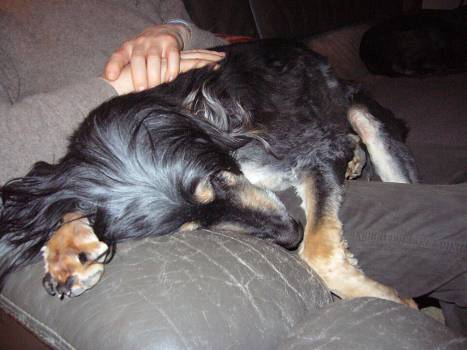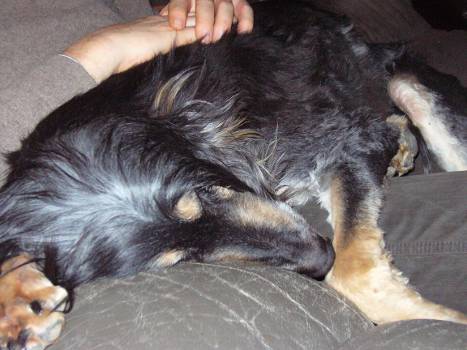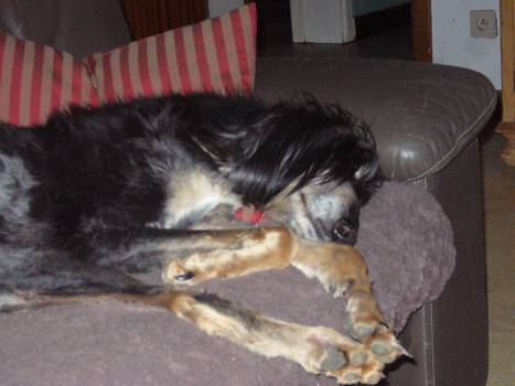 Hier ein erstes Bild von der 13 Jahre alten Patapouffe, der black & cream-farbenen Schwester von Piou Piou. Sie ist mittlerweile geschoren, das Bild entstand bei der Ankunft.