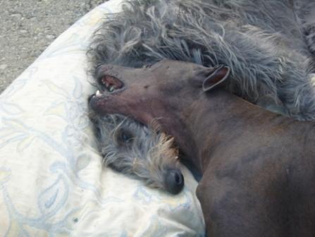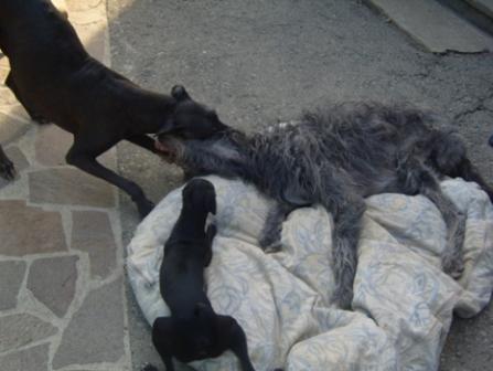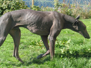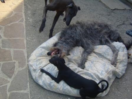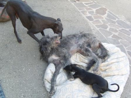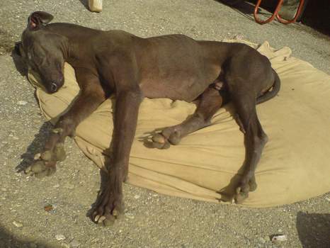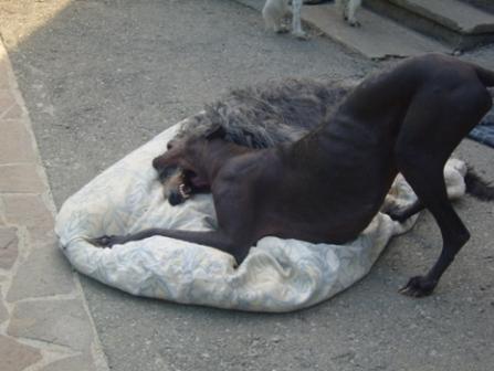 Als stolzer Deerhoundbub versuchte er einst als Welpe bei einem italienischen Herrchen sein Glück zu finden. Es hat sich nicht ganz aufhellen lassen, wie Leos Lebensbedingungen tatsächlich waren. Seine leicht rachitischen Vorderbeine lassen vermuten, dass Leo nicht ganz die Ernährung bekam, die er aufgrund seines schnellen Wachstums benötigt hätte. Wo bereits Ernährung einen Mangel darstellst, gehen nicht selten auch seelische Defizite einher. Jedenfalls meinte Leos Herrchen, dass dieser nackte Hund auf der Stelle weg muss. Nahm ihn, stellte ihn einer Tierschützerin, der man oft "Notfälle" bringt, vor die Tür und sagte: "Entweder du nimmst ihn, oder....."