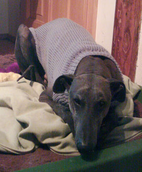 Der Winter steht vor der Tür. Leos Pflegemama hat eine "Afghanen-Freßmütze" für Leo gestrickt, aus dicker Schurwolle. Diese kann man über die Ohren ziehen und wärmt besser, als alles was wir bisher ausprobiert haben. Nur das Schwänzchen ist noch ungeschützt, aber auch da arbeiten wir dran.