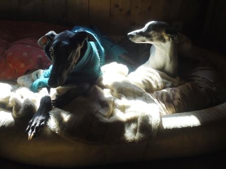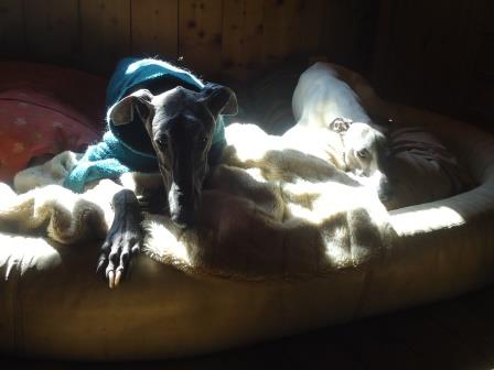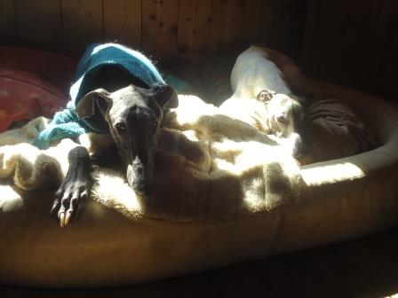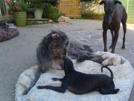 Mit Paten-Deerhound Leo und Pflege-Whippie Loeki waren wir den ganzen Morgen bei unserem Tierarzt. Loeki hatte eigentlich keine schlechten Zähne, aber sie hat in letzter Zeit immer mehr gerochen, so dass sie nun eine komplette, professionelle Zahnreinigung bekam und dabei stellte sich heraus, dass sie ganz entzündete, teilweise vereiterte Zahntaschen hatte.