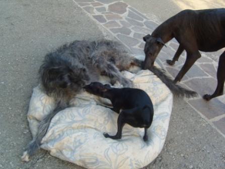 Leo sieht man leider äußerlich die gute Pflege nicht an, aber wer ihn von Anfang an kennt und ihn jetzt erlebt, ist begeistert. Leos Selbstvertrauen ist in letzter Zeit enorm angestiegen. Inzwischen sagt er deutlich den anderen seine Meinung und knurrt wie ein Wilder, wenn ihm was nicht passt. Leo bekommt ein bis zweimal am Tag "Tobeanfälle", dann ist nichts vor ihm sicher und schon gar nicht der Rasen, dem man hinterher genau ansieht, wo Leo langgetrampelt ist und wo nicht. Leo kann jetzt auch an der Leine laufen, rennt aber immer frei, dann rast er mit dem Barsoi der Familie über die Wiesen, ein herrliches Bild!